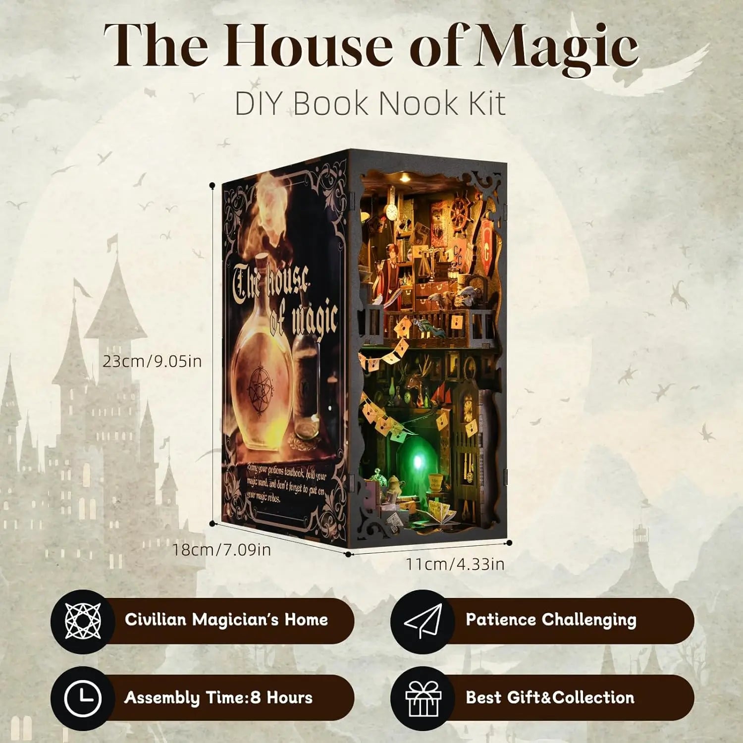 Turn your bookshelf into a magical scene with the Book Nook “The House of Magic,” a DIY diorama that recreates a miniature school of wizardry. This craft kit is designed for fantasy fans, miniature collectors, and DIY lovers. Every corner is filled with enchanting details: shelves of spell books, potion bottles, floating cloaks, secret staircases, and warm lights that create a mysterious atmosphere. Inspired by worlds like Harry Potter, Narnia, and Alice in Wonderland, this Book Nook is a creative experience that invites you to build your own magical world.